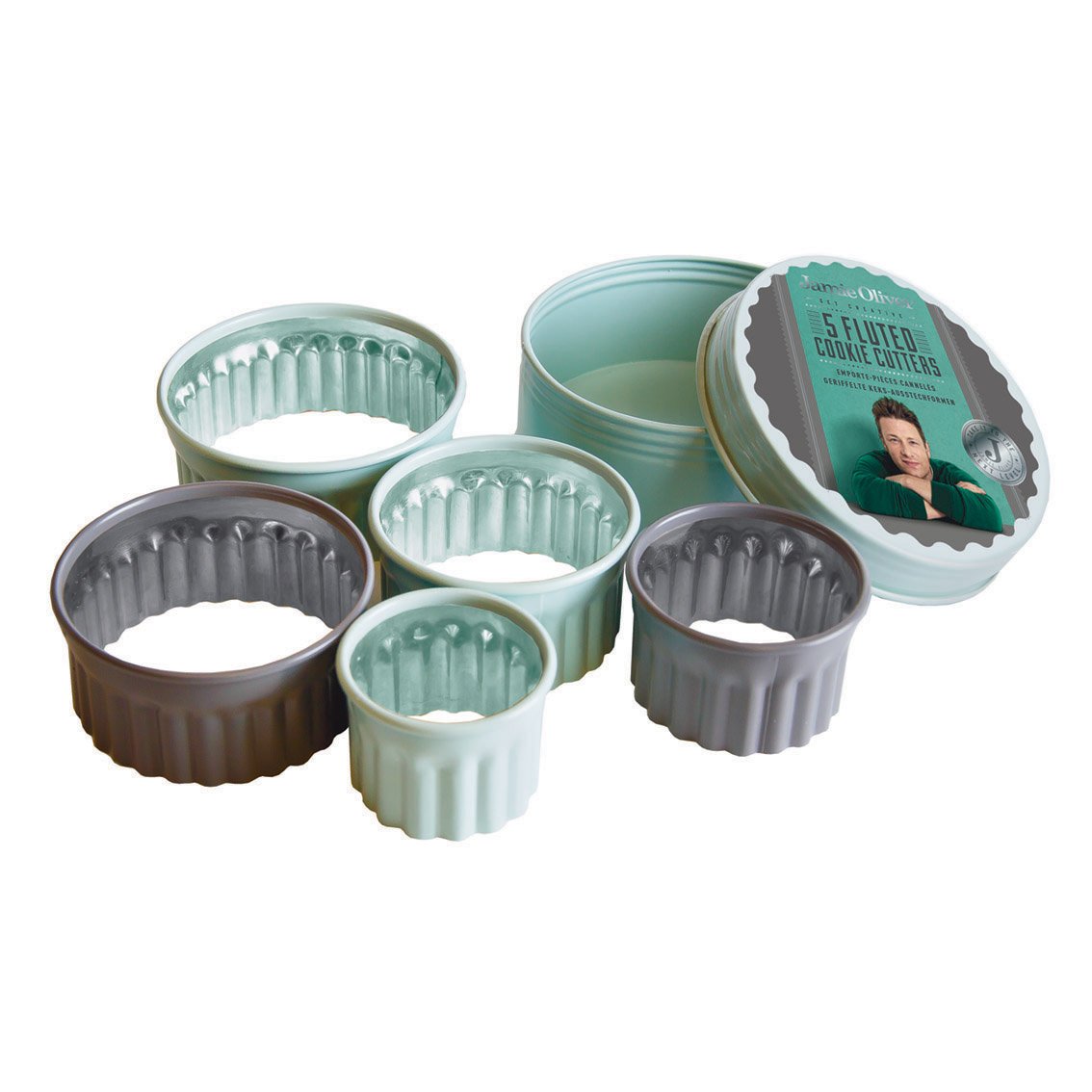 Fünf geriffelte Keksausstecher im Set. Unterschiedliche Durchmesser.